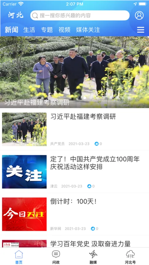 “首页”版块设置“新闻”、“生活”、“专题”、“视频”、“媒体关注”等五个频道,以不同形式提供生动、鲜活的新闻资讯。以文字、图片、短视频等形式,全方位呈现河北重大政策措施、地区发展成果、百姓幸福生活。