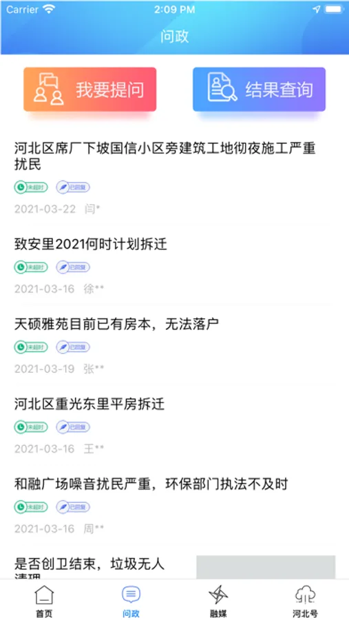 “问政”为群众反映问题的政务服务功能,网民可以将遇到的问题反映至区长或区委书记,并通过查询码对问题进行结果查询。