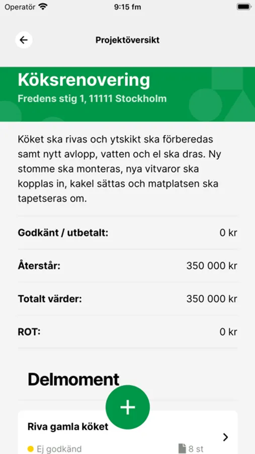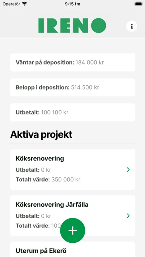 * Hantverkaren kan se en översikt av sina pågående projekt på app.ireno.se