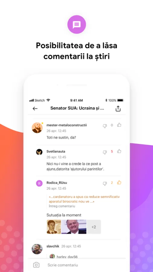 - Conexiune. Ai posibilitatea de a transmite redacției propriile știri/materiale foto, video, dar și de a comenta orice noutate.
