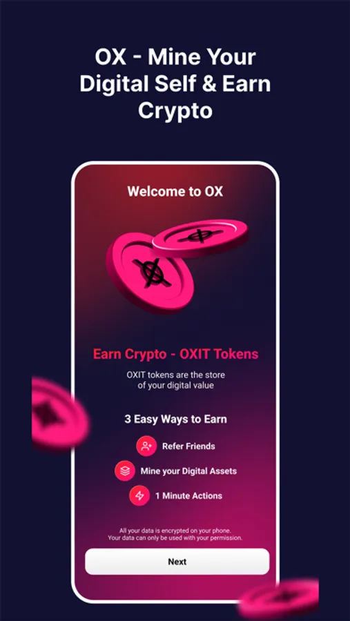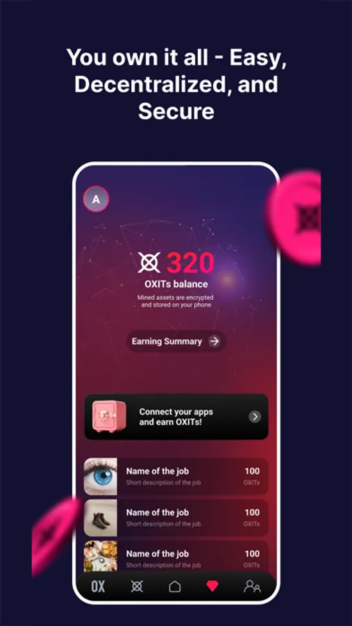 The OX app is decentralized, giving you total control of your data privacy and ownership. All mined assets are securely stored and encrypted only on your phone, only you have access to it.