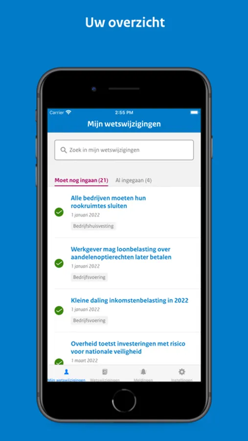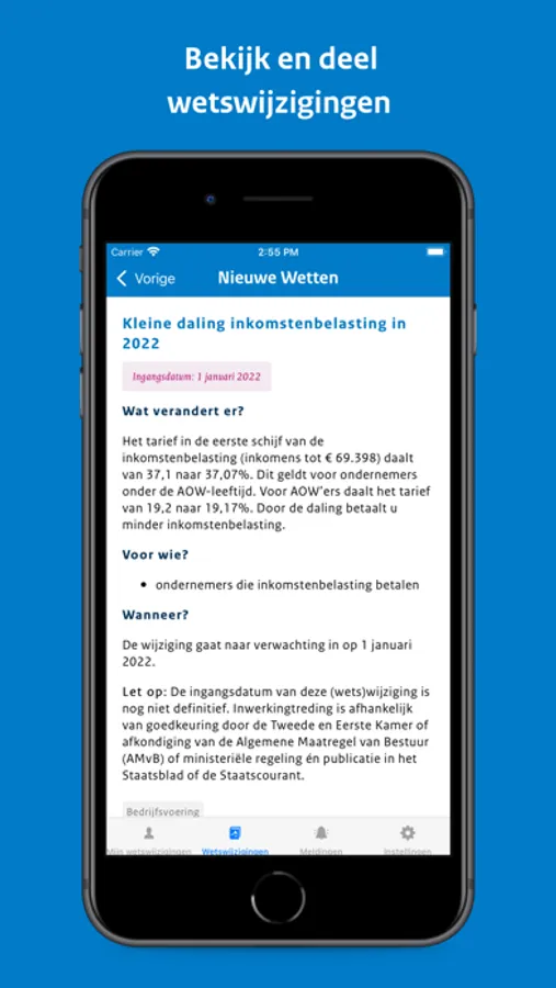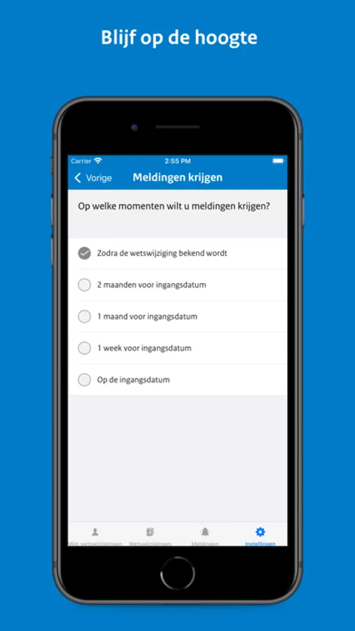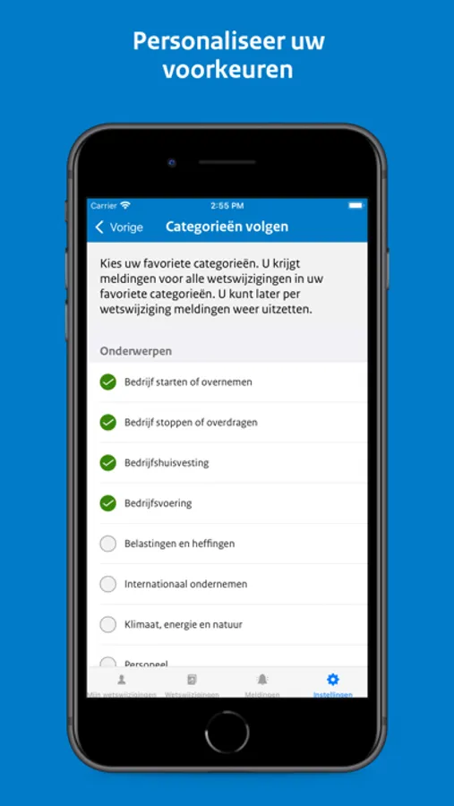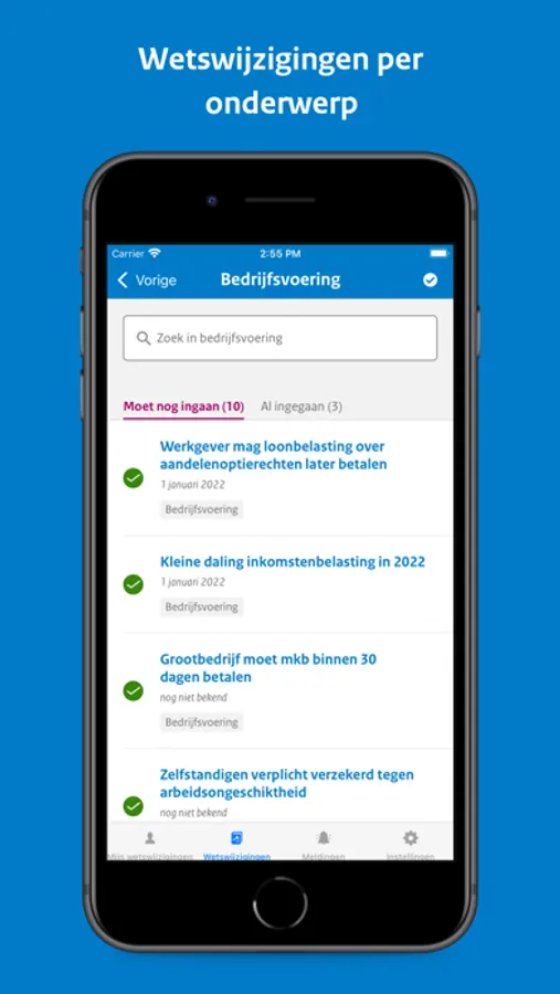 In de app vindt u wetswijzigingen die nog moeten ingaan en wetswijzigingen die de afgelopen 6 maanden zijn ingegaan. Bent u geïnteresseerd in belastingregels of personeelszaken? Heeft u een winkel, horecabedrijf of kinderopvangorganisatie? Of bent u zzp’er? U kiest zelf uw favoriete onderwerpen of de branche waarin u werkt. De app geeft u meldingen op maat.