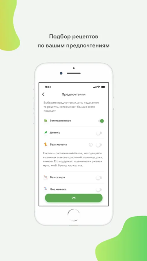 Также в приложении можно выбрать свои предпочтения: вегетарианское или детокс меню, рецепты без глютена, молока и сахара. Это особенно актуально для придерживающихся здорового питания и диет.