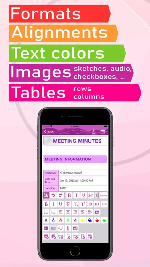 Do you need to integrate text, photos, images, sketches or audio? Would you like to create documents with style containing tables, to-do lists or highlighted text? Then Take Rich Notes can help you.