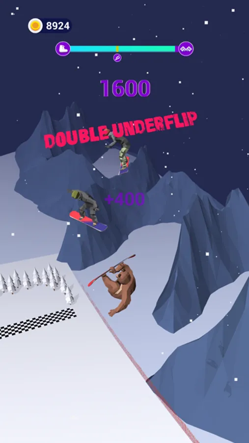 Compete with other opponents down the slope. Perform pro tricks to get points and unlock new places for snowboarding.