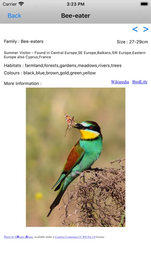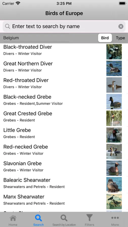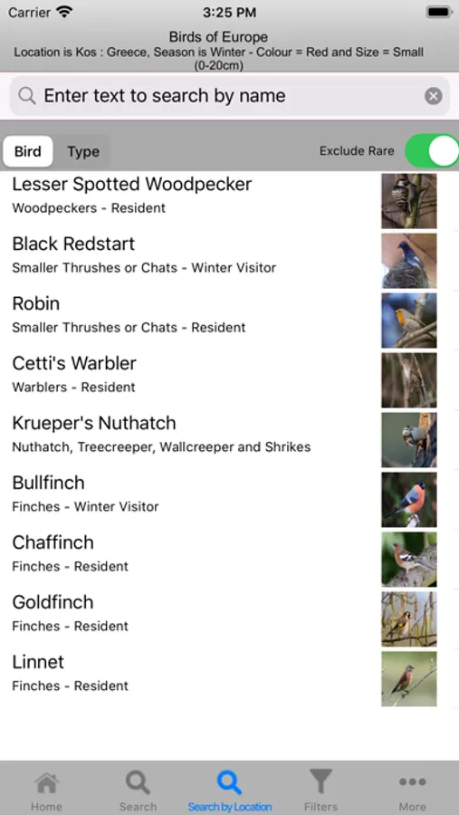 Search option : Search by name or part of name to see basic bird details such as size, habitat and colours. You also have the option to see full bird details on line.