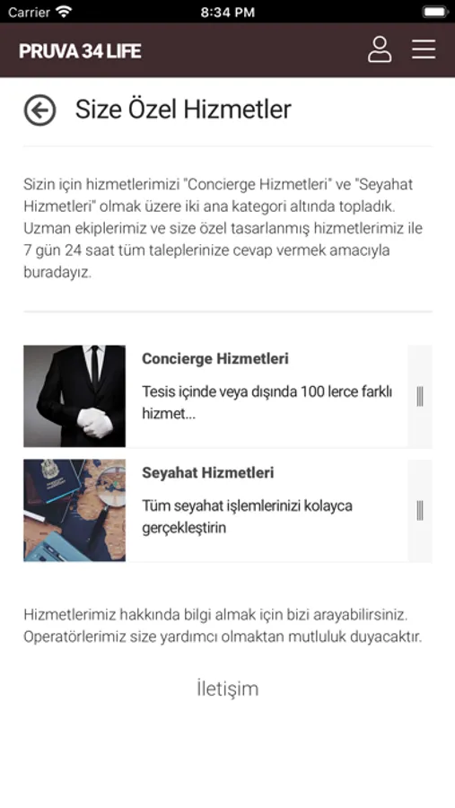 PRUVA 34’nın sunduğu concierge hizmetlerinden faydalanmak artık çok kolay. Yurt içinde ve yurt dışında dilediğiniz tüm hizmetlere PRUVA 34 Concierge uygulaması üzerinden rahatça ulaşabilirsiniz.