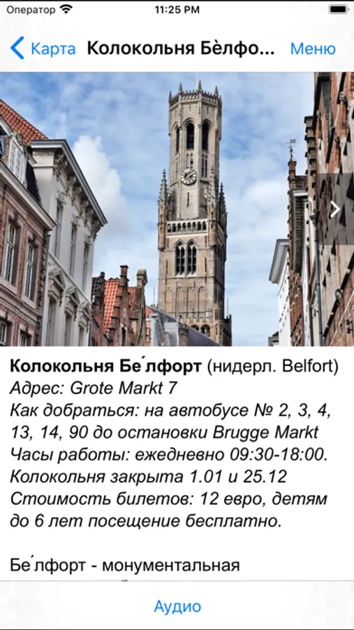 ● АУДИОГИД ПО БРЮГГЕ. Рассказы аудиогида озвучены профессиональным диктором. Слушайте рассказы, не отвлекаясь от осмотра достопримечательностей и не теряя время. Не стоит лишний раз портить зрение, читая на ходу текст на небольшом экране.