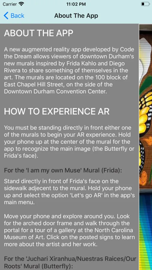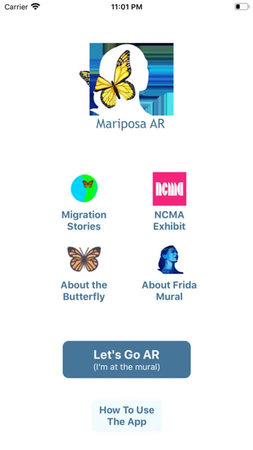 Mariposa AR allows users to learn more about the artists, the murals, and the Frida y Diego North Carolina Museum of the art exhibit that inspired them in an augmented reality environment. Additionally users are invited to share their own migration stories as well as learn more about the migration stories of other users.