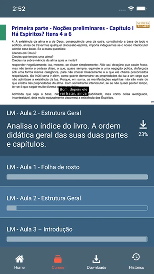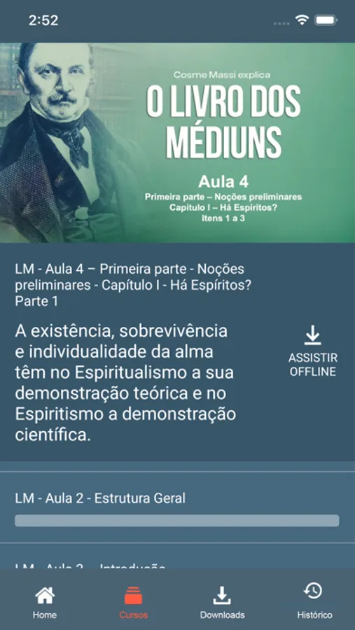 Inicialmente, você terá acesso ao estudo por itens de O Livro dos Espíritos, a primeira e mais completa obra de Allan Kardec. Estamos na segunda parte dessa obra e já temos mais de 50 seminários. A fim de complementar seus estudos das obras fundamentais de Kardec, disponibilizamos também diversos títulos sobre Filosofia e Filosofia Espírita. Tudo de forma estruturada para que você navegue facilmente por todo o conteúdo abordado.