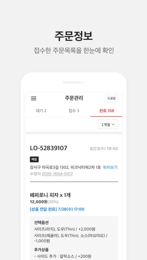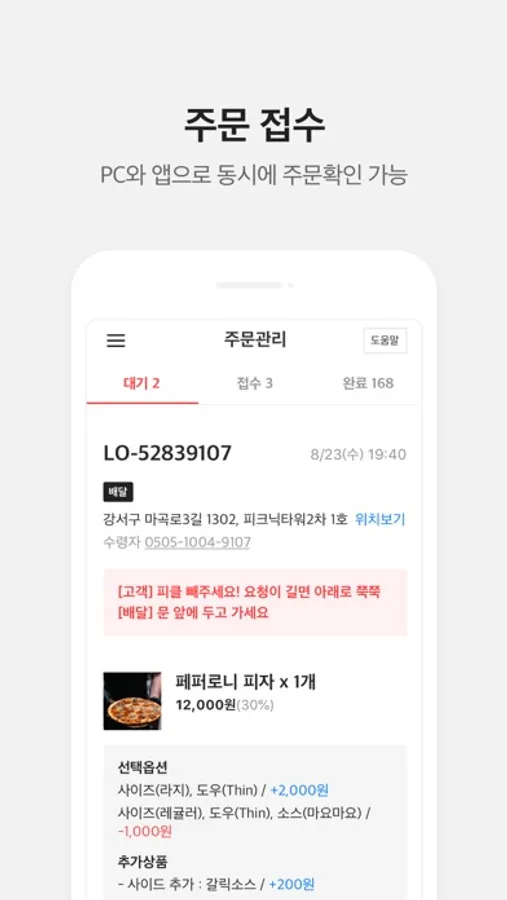 * 주문이 발생하면, 주문관리의 '대기'목록에 보여집니다.
