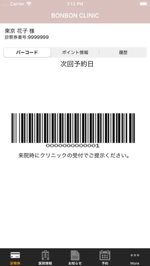バーコードをかざすだけで受付出来るチェックイン機能、次回ご予約日時表示など、カードレスな診察券としてご活用頂けます。