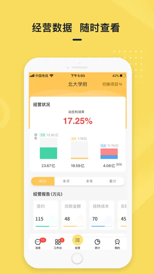 城房金管家APP是北京城房宝智慧城市科技有限公司研发的一款针对企业经营的管理系统,通过对计划、财务、成本的管理,及时反映企业经营状况,为企业决策者提供决策依据。在线计划,时时可控化:里程碑及各项计划,进程一目了然,计划节点智能预警;经营指标,时时动态化:财务、成本、运营,经营目标与成果,时时动态呈现;利润考核,时时数字化:利润预期与结果,通过数字化管理,保障企业良性发展。