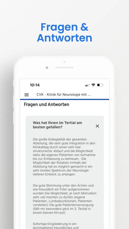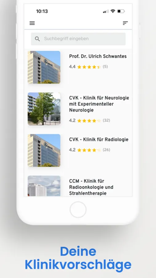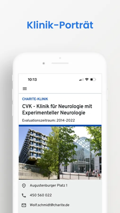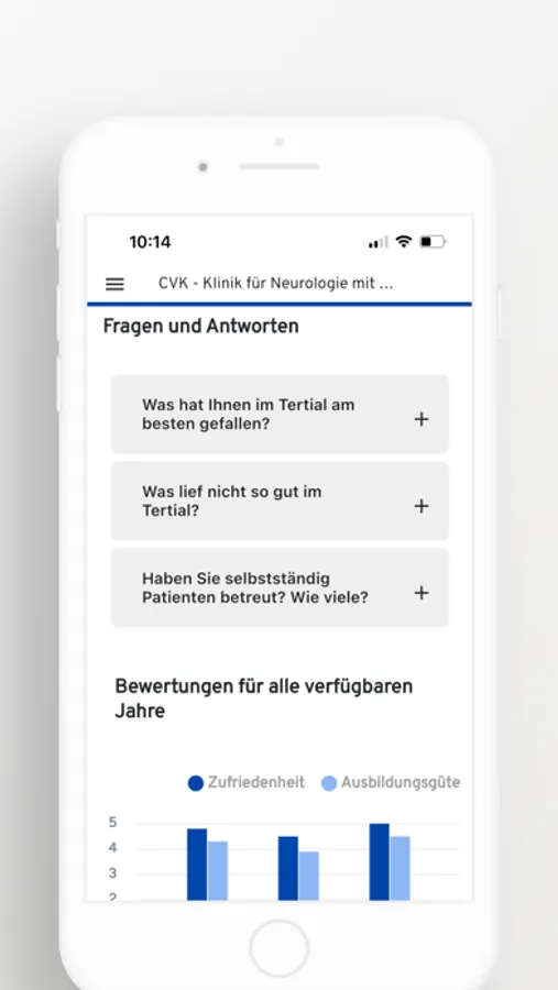 Diese App hat die Fragebögen strukturiert erfasst und ausgewertet. Anhand eines „Sets“ an Fragen wurden die einzelnen Kliniken / Institute bewertet und in einem Ranking zusammengefasst.
