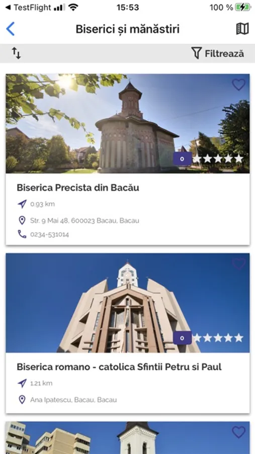 Toate elementele pot fi sortate alfabetic sau dupa distanta. De asemenea, se pot folosi optiuni de filtrare, in functie de tipul de punct de interes.