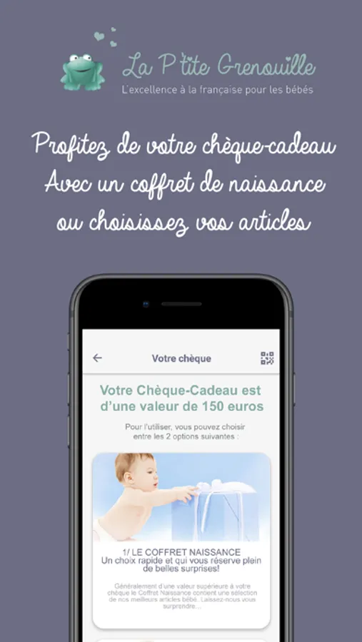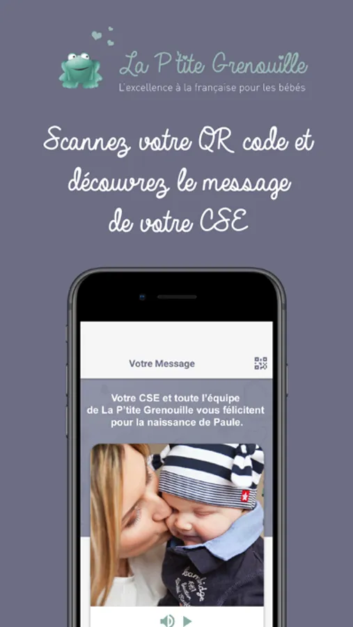 Bébé est né… Félicitations, on pense à vous ! Grâce à La P'tite Grenouille, choisissez votre colis naissance ! Notre App permet aussi de recevoir un message de félicitation et d'envoyer vos remerciements à l'expéditeur. Merci !