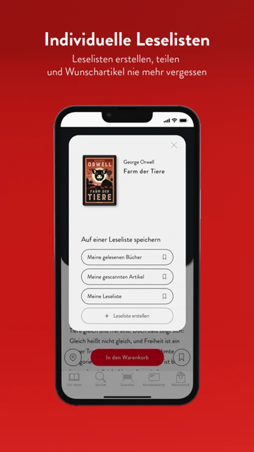 Individuelle Leselisten: Stellen Sie viele persönliche Merklisten zusammen, halten Sie Empfehlungen und Tipps Ihrer Freunde fest oder erstellen Sie Ihre Wunschliste für den nächsten Filialbesuch! Mit dem Scanner können Sie sogar alle Bücher aus Ihrem Bücherregal unkompliziert in der App speichern und haben so immer den Überblick über bereits gekaufte oder gelesene Bücher!