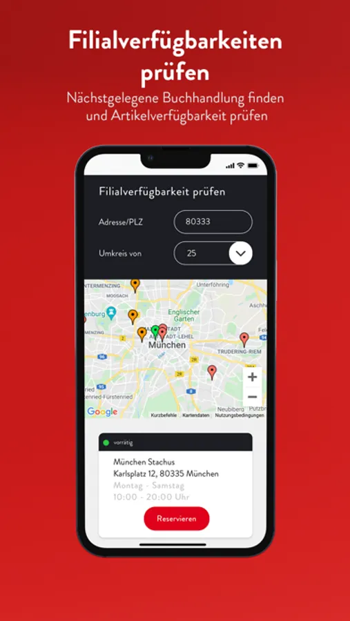 Filialfinder: Unser praktischer Filialfinder zeigt Ihnen immer genau an, wo das nächste Leseabenteuer beginnt! Finden Sie ihre nächstgelegene Buchhandlung und erhalten Sie alle nötigen Informationen. Außerdem können Sie sofort überprüfen, ob Ihr Wunschartikel in Ihrer Lieblingsfiliale vorrätig ist.