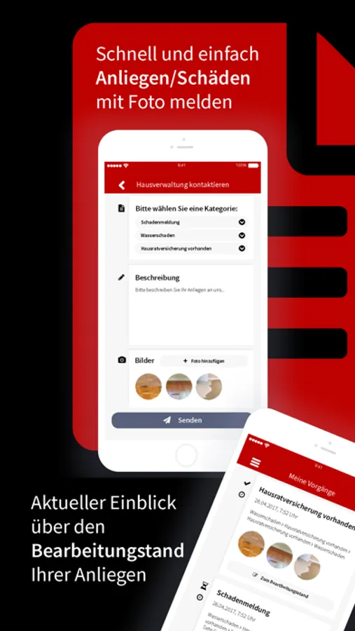 Als Mieter oder Eigentümer können Sie Schäden oder Anliegen direkt mit Fotos über unsere App melden. Ihre Anfragen stehen unseren Mitarbeiten dann zur Bearbeitung zur Verfügung und können auch an Handwerksbetriebe weitergeleitet werden.