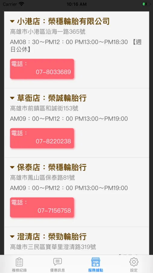 「榮穩輪胎有限公司」登記設立於民國82年,距今已有23年。除了總店之外,尚有直營店6家,及7家合作同業,專門服務高屏地區汽車輪胎及車主,輪胎品牌以國際知名品牌為主,堅持品質與服務,至今至少銷售超過50萬條輪胎,堪稱高屏地區最大輪胎銷售保養集團,努力成果終獲國際大廠肯定!特別是「法國米其林、德國馬牌、日本普利司通」三大品牌輪胎紛紛前來合作並成立旗艦店或最高等級服務中心!