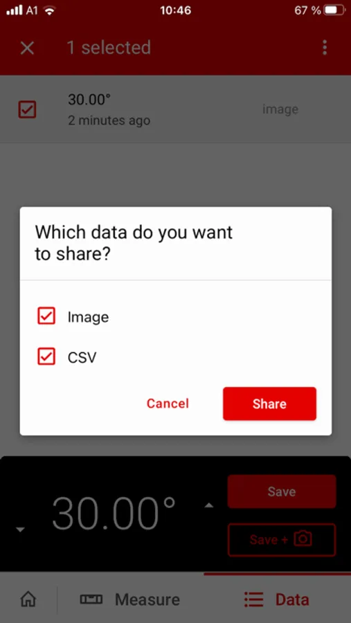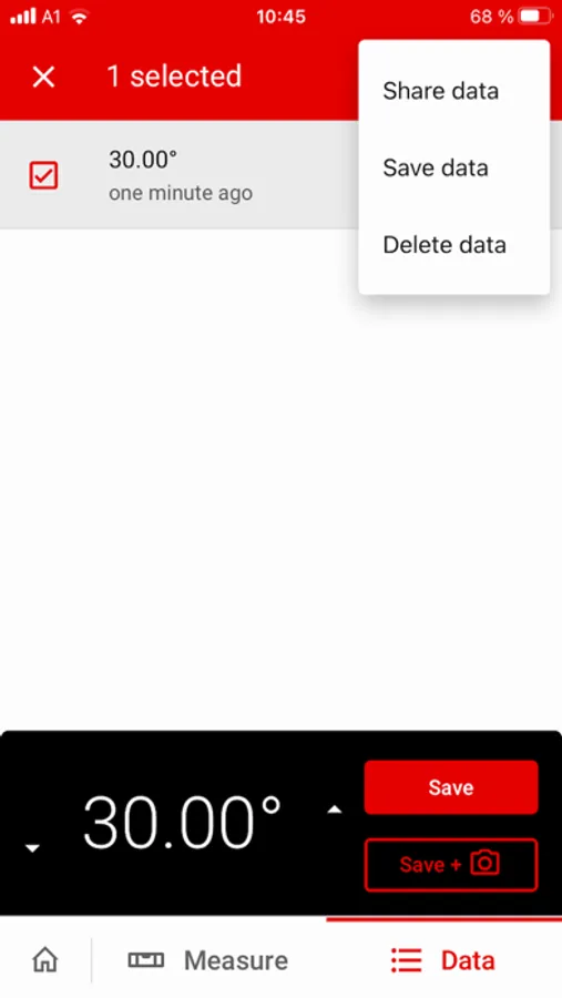 Real-time data such as the date, time and location are automatically recorded for each measurement in the app’s measured value memory. You also have the option of adding notes, photos or videos to the measured values. One useful tool contained in the app is the Photo-Overlay export. With this tool, when you photograph your real working or measuring situation with your smartphone, the real-time data such as the measured value, date and time are also displayed and stored directly on the photo. The measured values including all key data can be easily and quickly shared with your team at any time.