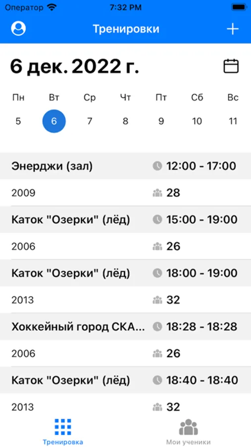 Приложение для тренеров. В приложении тренер может добавлять в свое личное расписание: тренировки, записывать учеников, удалять тренировки, добавлять в групповые тренировки учеников.