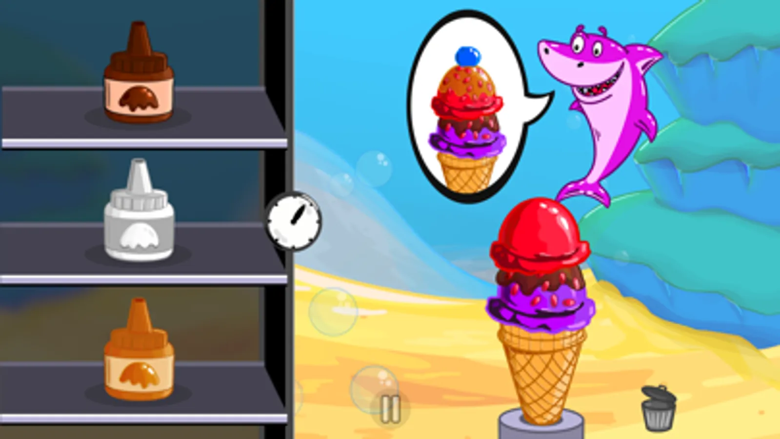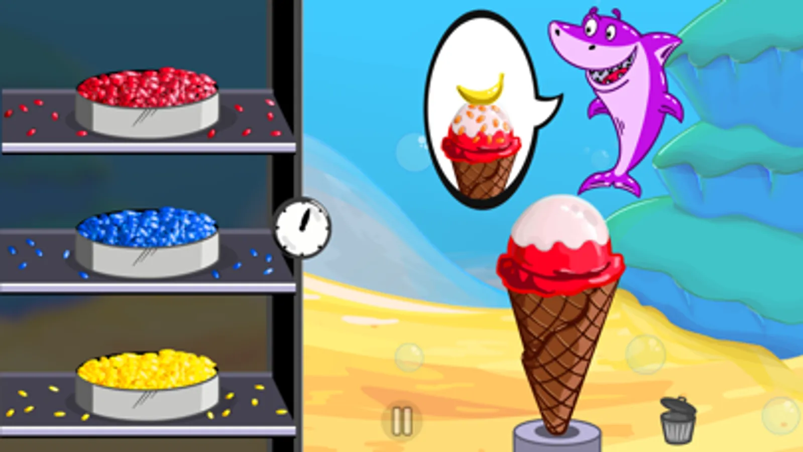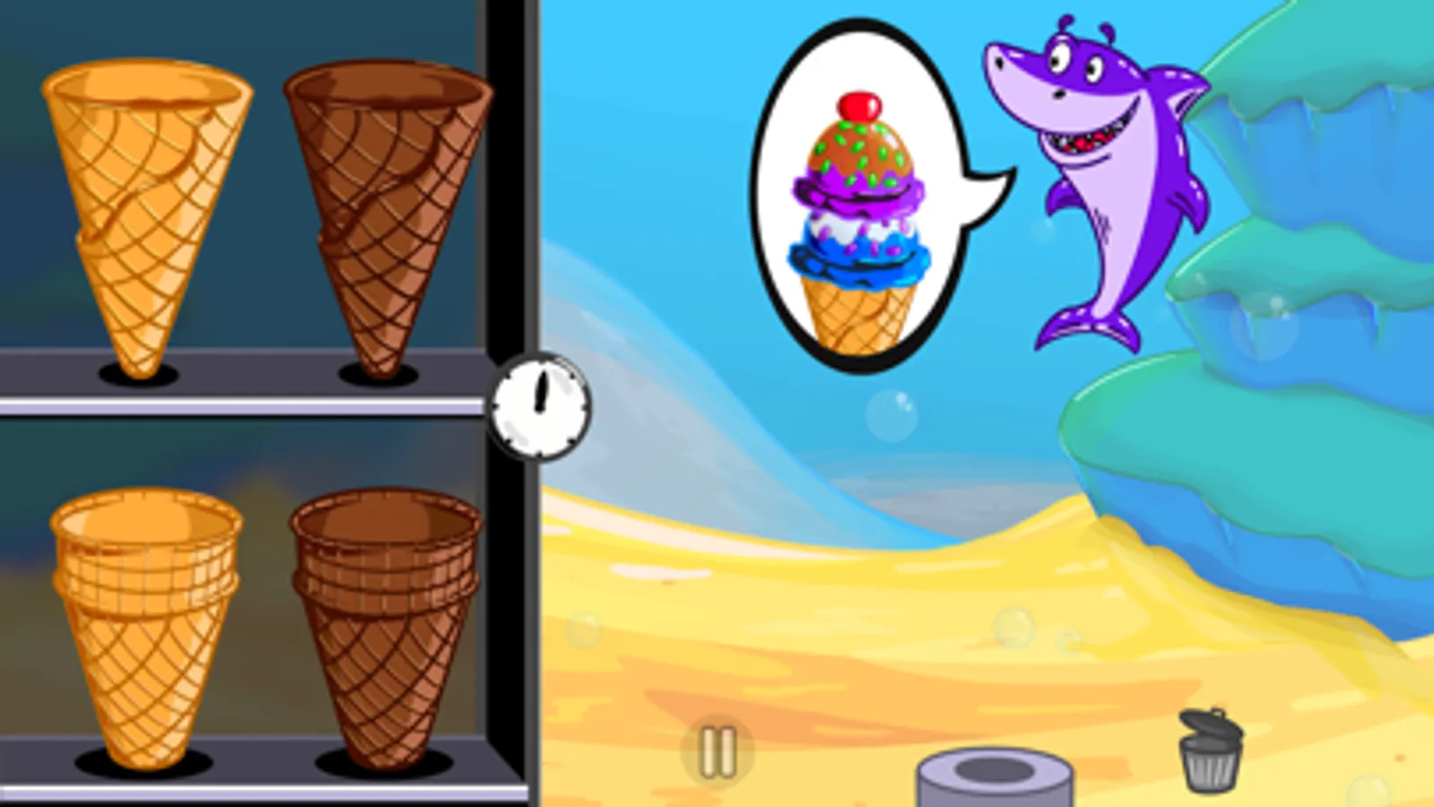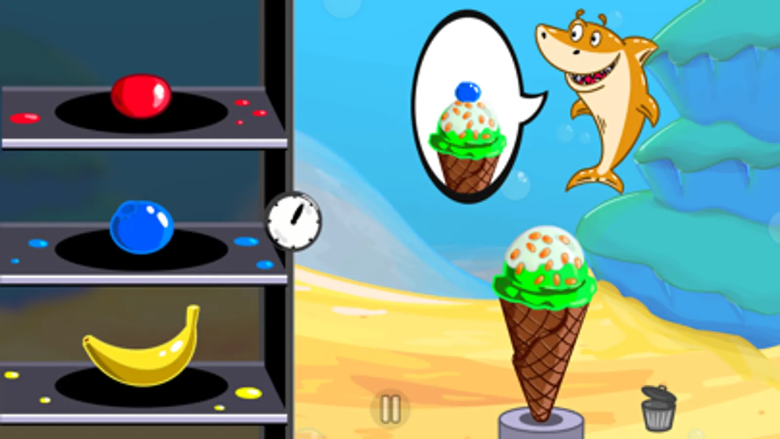 Ice Cream Mixer Orders is a game that involves creating ice cream orders for a group of hungry sharks. Ice cream scoops come in Red, Yellow, and Blue, and can be mixed into Green, Orange, and Purple. Toppings include Fruit, Sprinkles, and Syrups. Players are given 8 lives, with each round lasting 3 minutes (Watch ad for additional lives). Players must collect coins in order to work their way up the leaderboards!