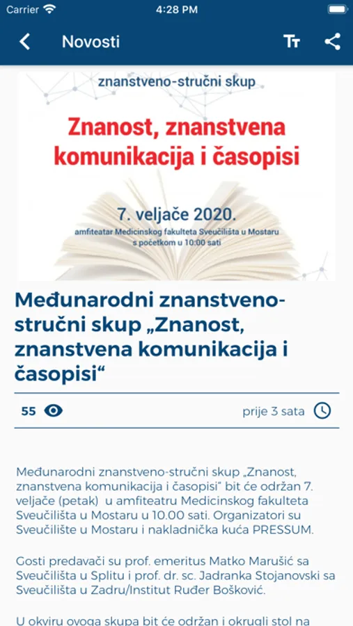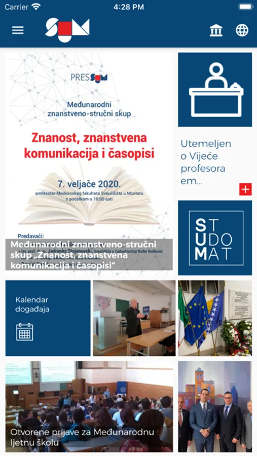 Aplikacija namijenjena studentima i predavačima Sveučilišta u Mostaru. Omogućava pregled vijesti na Sveučilištu, pregled i prijavu ispitnih rokova, te dodavanje događaja u vlastiti kalendar.