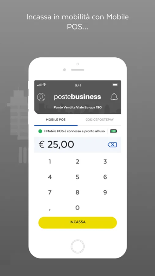 Per poter incassare associa il dispositivo Mobile POS all’ App PosteBusiness sul tuo smartphone/tablet (abilitato alla connettività dati in modalità Wi-Fi o 3G/4G e dotato di tecnologia bluetooth).Come?