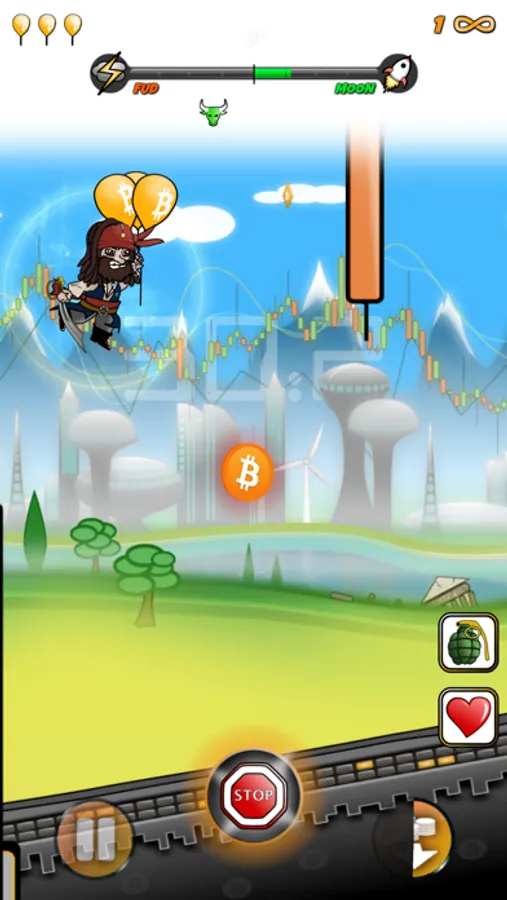 Grab your balloons and enjoy a challenging adventure through the gamified crypto world of BITCOIN HODLER with an environment that changes based on live market data. Navigate the charts, incoming forks, bad news & taxes to protect and maximize your ingame funds. Push your sentiment far into the green to activate your spacecraft and shoot to the moon!