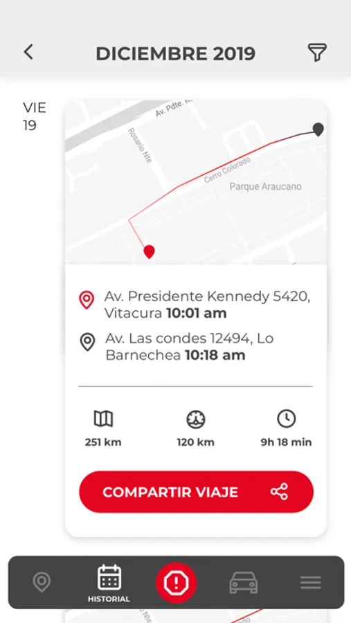 Con Sensor Inteligente Derco podrás llevar un registro de todos tus viajes, conociendo las distancias recorridas, velocidad máxima, costo en combustible y el tiempo transcurrido en cada viaje. También tendrás la opción de compartir tus viajes con quién tú quieras.
