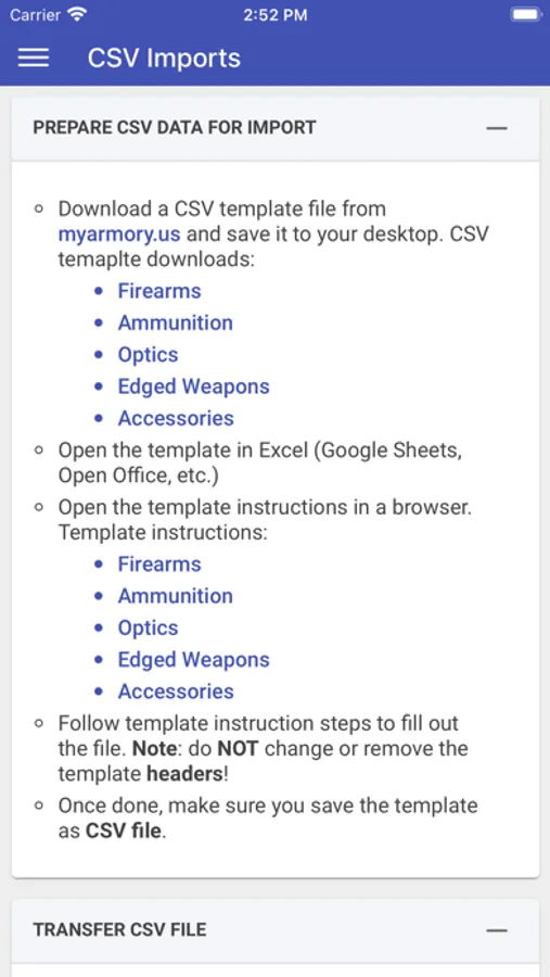Importing your firearm information has never been easier. Whether you prefer to use your computer or already have data in a CSV file, we've got you covered. Simply download the CSV template from myarmory.us, fill it out on your desktop computer, and transfer the file to your mobile device using Dropbox, Google Drive, iCloud, or any other file-sharing tool. Once your data is transferred, simply open the My Armory app and import the data. No need to worry about manual data entry or starting from scratch. With the greatest gun app, you'll have all your firearm data in one place, accessible from anywhere at any time.