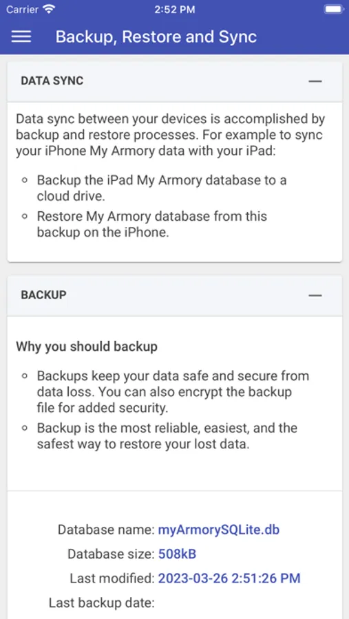Your firearm data is always secure and backed up. You can easily backup and restore your data to and from the cloud drive of your choice, ensuring that you never lose any important information. Plus, with our sync feature, you can effortlessly keep your data up to date across multiple devices using a backup file.