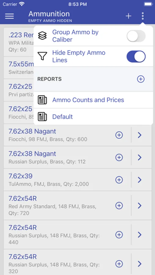 Sharing your firearm inventory data and gun info has never been easier! With just a few taps, you can quickly generate and download a detailed report in either CSV or PDF format. You can include images of your firearms in the PDF for easy visual identification. And you can access a range of detailed inventory reports, such as "Last Clean Dates by Firearm," "Purchased and Sold Prices," "Current Values," "Ammunition Counts by Caliber," and many more.
