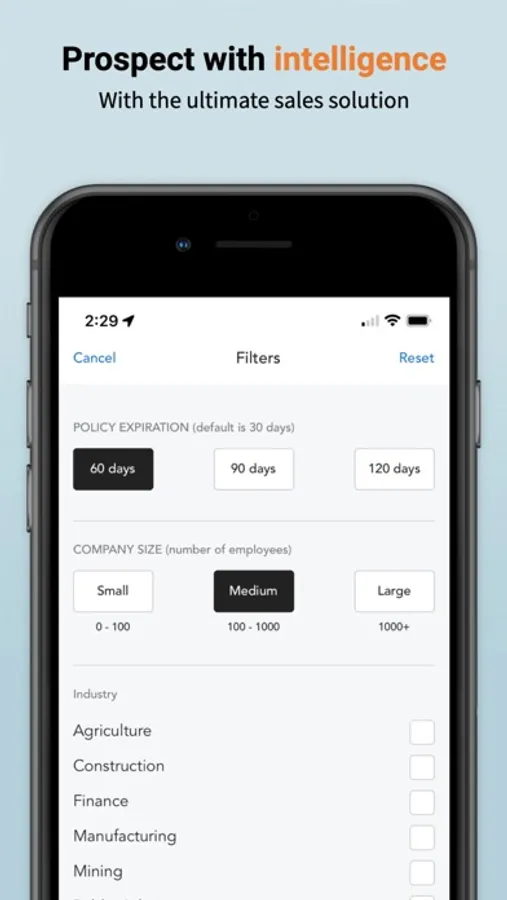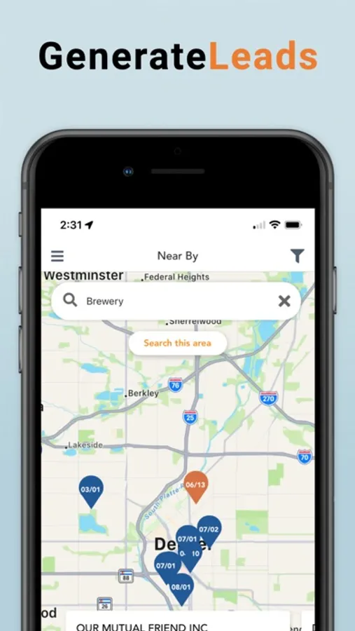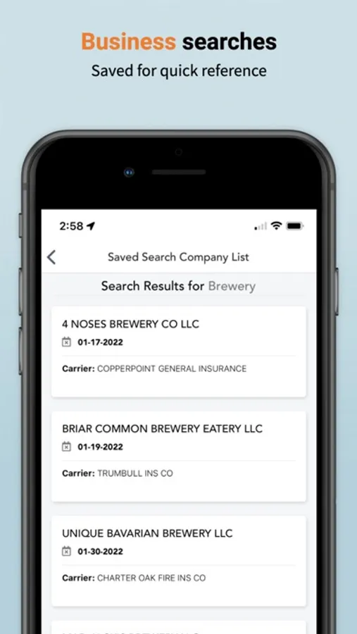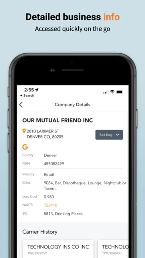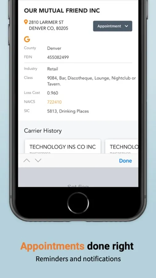 Commercial Insurance Prospecting done right. Have an appointment on the other side of town? Wouldn't it be great to see if there are any other near by opportunities while you're in the area? Now you can with our new mobile app! See which businesses are coming up for renewal, who the incumbent carrier is, the rate they're paying, and more! Access key areas of the web service like your Latest Flags to make follow up calls, or use the name search to look up that manufacturing company you passed on the way here. Generate Leads. Win New Biz. Your location is used to find nearby businesses.