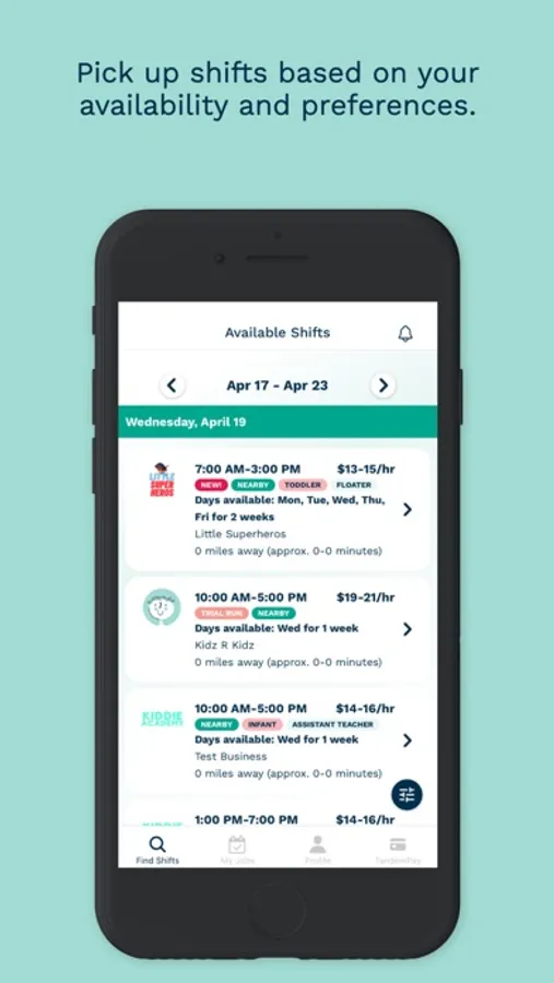 It is our mission to allow child care workers to pick up shifts at child care centers, on their own terms. We help workers browse a variety of child care center shifts in their area. The available shifts may align with the worker’s schedule, pay or distance preferences, and experience. Workers will be able to set up a TandemPay account, where they will receive their funds. Through their TandemPay account, workers can immediately spend, save, or transfer their funds.