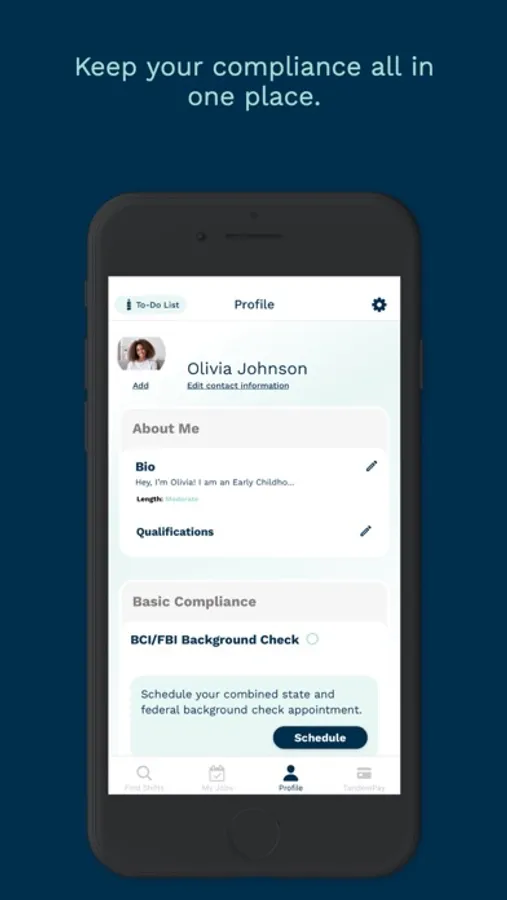 • Walk through a seamless, in app experience to get credentialed to meet state-requirements to work in a child care center. This may include completing or uploading a background check, uploading documents, and/or completing trainings.