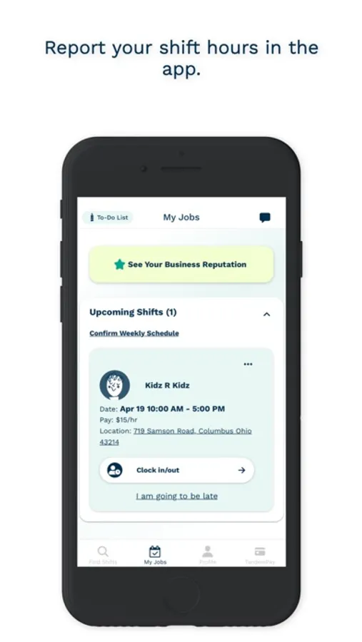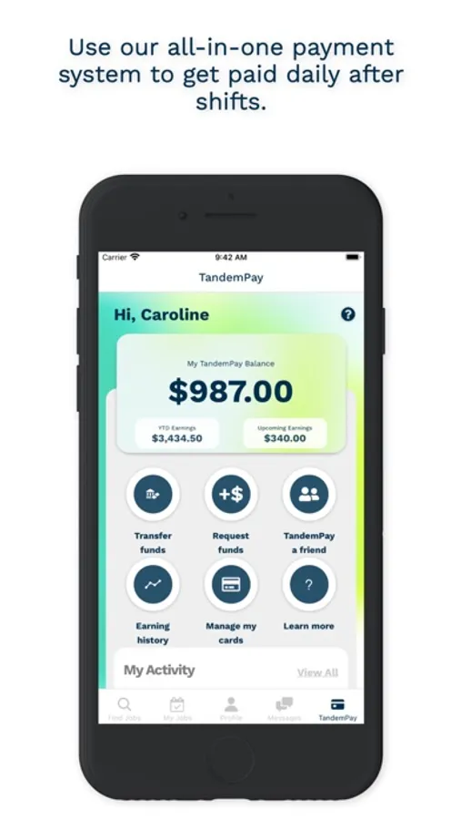 • Receive payment after shift into your TandemPay account, where you can immediately spend, save, or transfer your earnings.