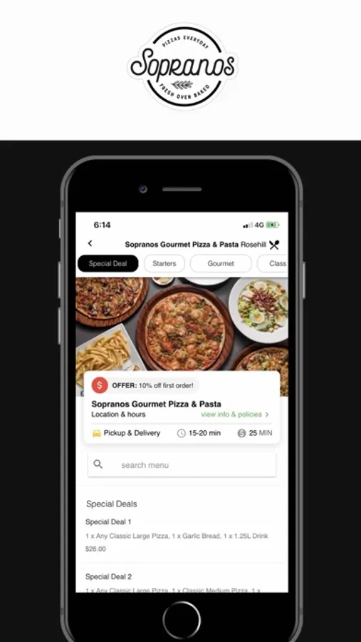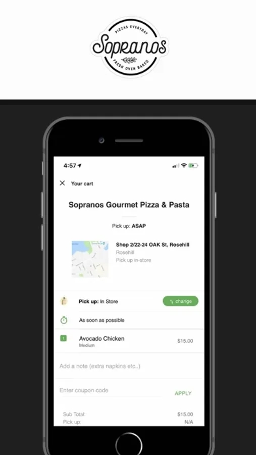 Pre-order your food and drinks with our Sopranos Gourmet Pizza, Pasta & Kebab App and pay using Cash, Loyalty or Credit Card.