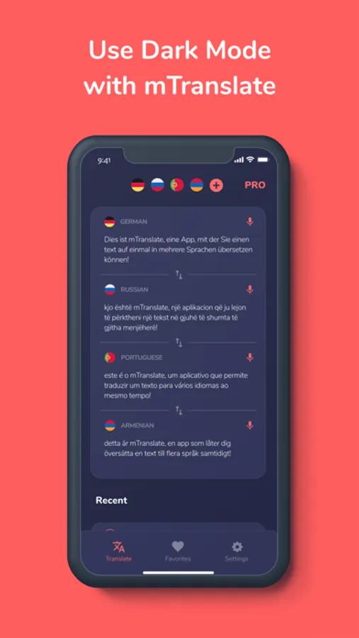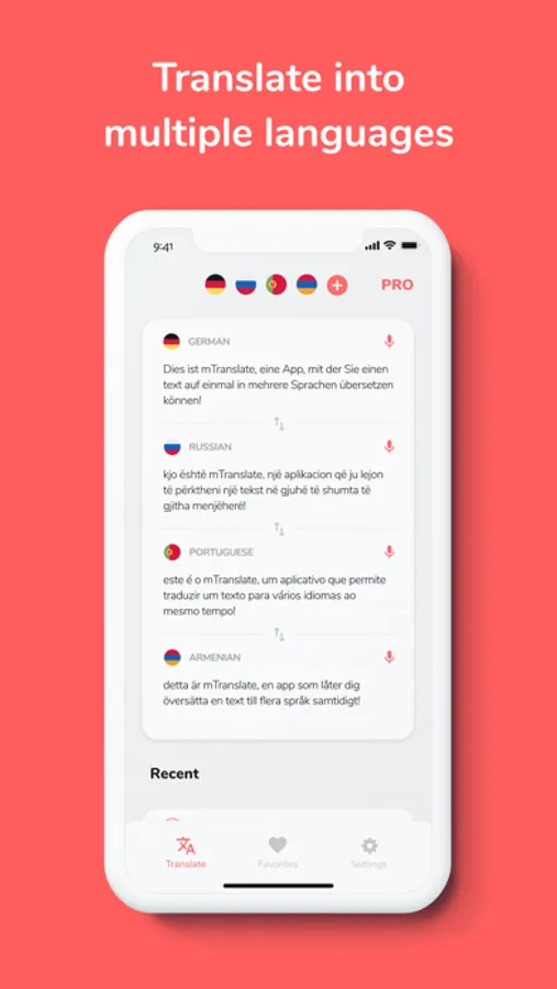 mTranslate allows you to translate into multiple languages at once, just add languages you want and when you write something in one field the app will automatically translate into your selected languages.