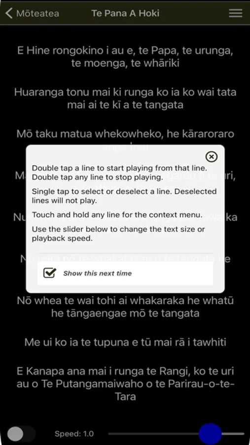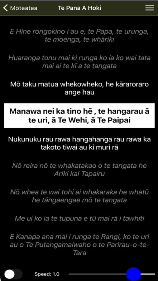 Beginners and novices often find it very challenging to learn and retain taonga like these, especially when not directly under the tutelage of learned and experienced teachers. This app is a tool for learning by rote. Each item provides the words (lyric) and one or more recordings, which can be played repeatedly. Most of the items can be played a line at a time; You can select which lines you'd like to focus on and the app plays only those lines, repeating the sequence indefinitely. At any point, you can simply touch the next line to add it to the group being played.