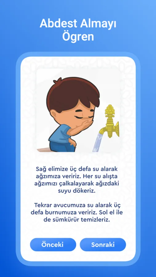 İslamın direği namazı çocuklarımıza kısa ve kolay şekilde eğlenceli bir biçimde anlatın. Ayın şekilde namaz öncesi Abdest nasıl alınır bunuda kolayca görsellerle öğretin. Bunun anı sıra namaz surelerini sesli ve yazılı olarak kolayca çocuklarınıza öğretebilirsiniz. Aynı zamanda anlamlarınıda öğreterek bilgilerini geliştirebilirsiniz