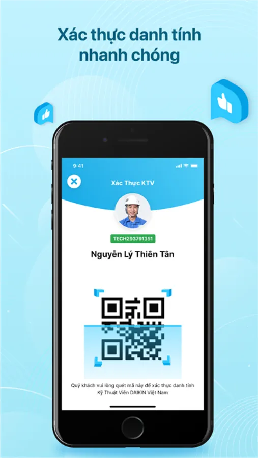 - Hiển thị mã QR của kỹ thuật viên để khách hàng quét và xác đinh danh tính