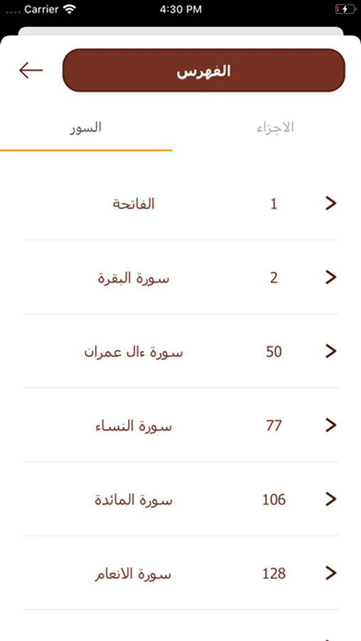 4- وجود فهرس للسور مع إمكانية الانتقال للسور من خلاله.