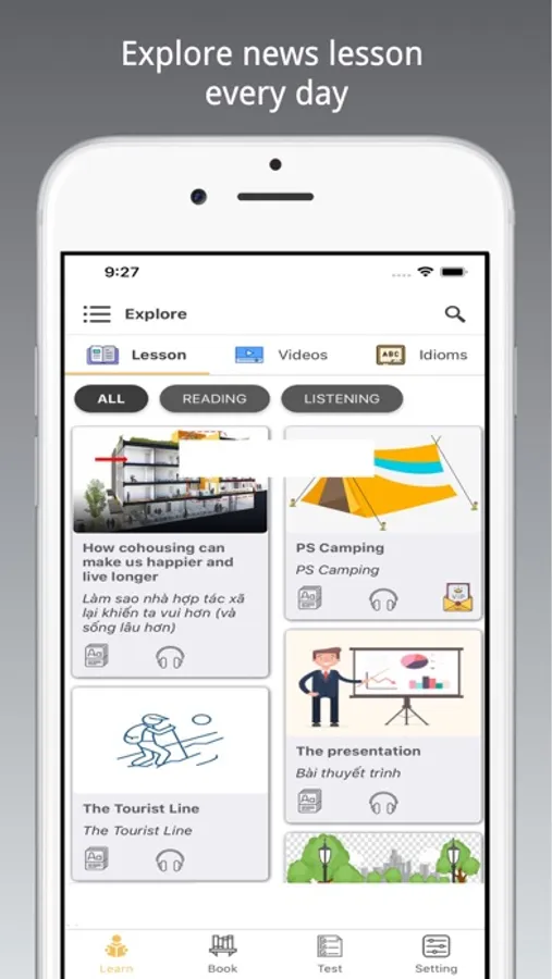 - Phân loại các bài học theo các kỹ năng: Nghe, Nói, Đọc, Viết.