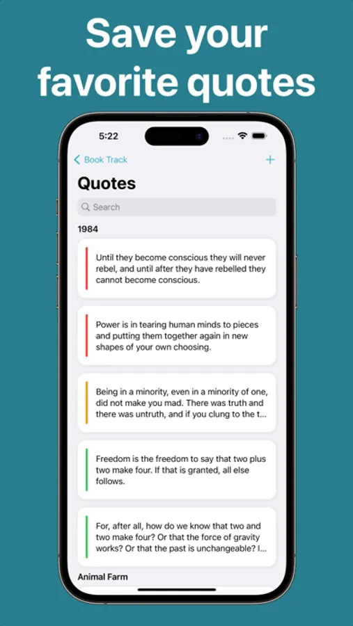 - Quote saving — Find a passage within a book that you want to save for later? Book Track can save your favorite quotes in one place so you can read them again later. You can even put them on your Home screen using a widget.