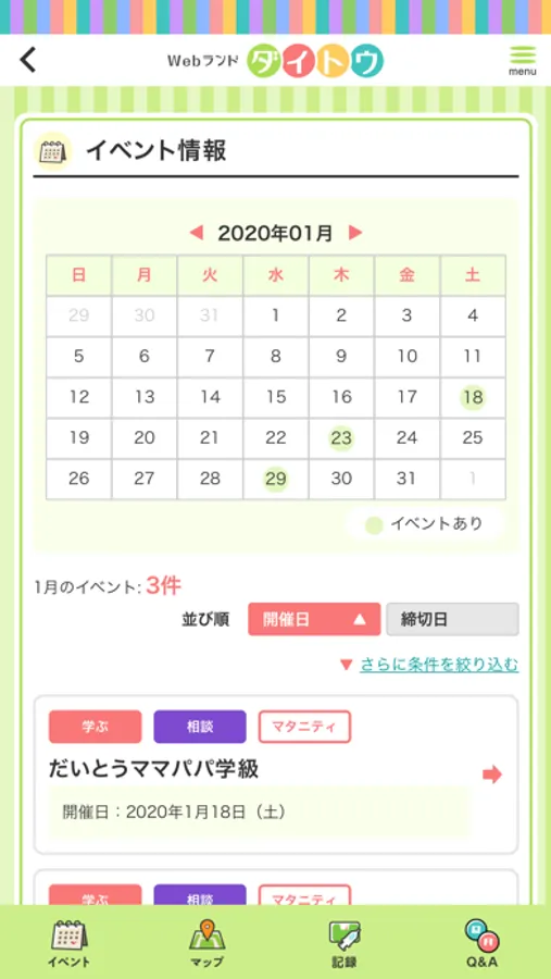 学ぶ、あそぶ、いくカフェ等のカテゴリーや年齢のカテゴリ、無料のイベントなどを検索できます。