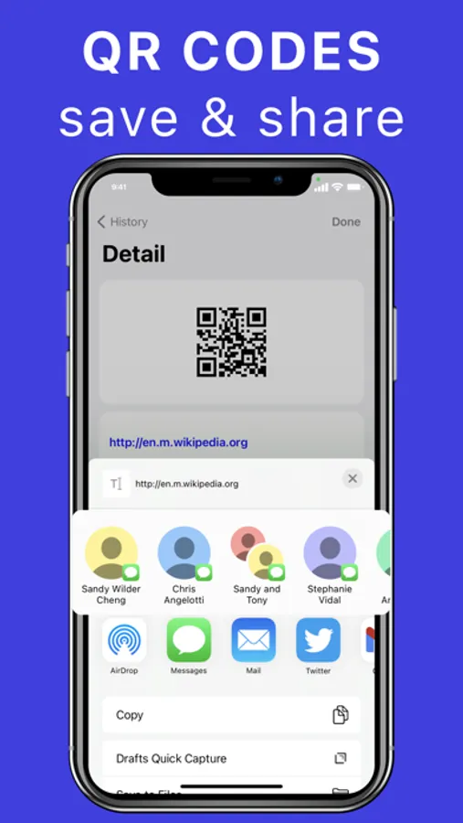 Easily generate QR codes for Wi-Fi, contacts, websites, messages—you name it. Share them anywhere with a single tap.