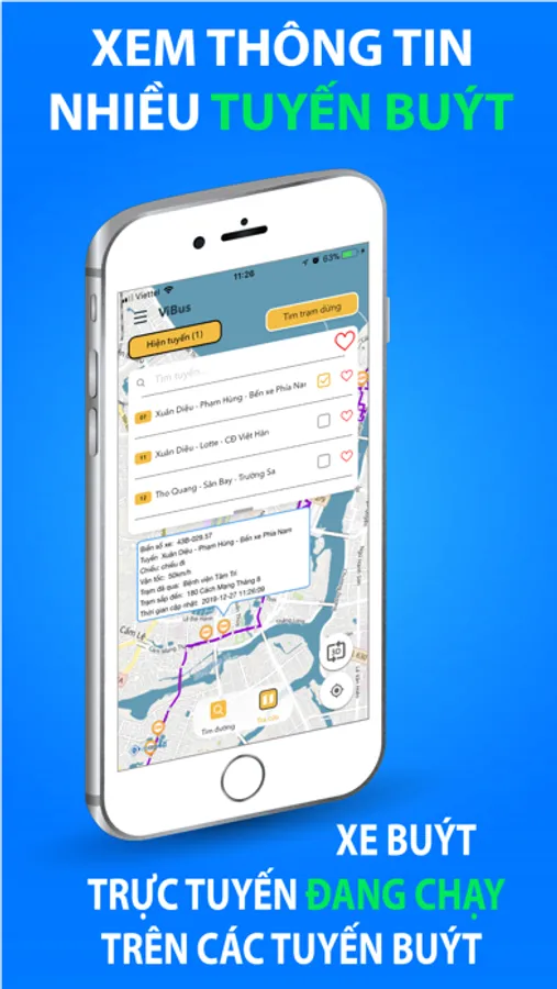 - Xem thông tin tuyến buýt: hiện xe buýt trực tuyến đang chạy trên các tuyến buýt, danh sách trạm dừng trên tuyến theo lượt đi, lượt về, thông tin giá vé cho từng tuyến, khoảng cách tuyến.