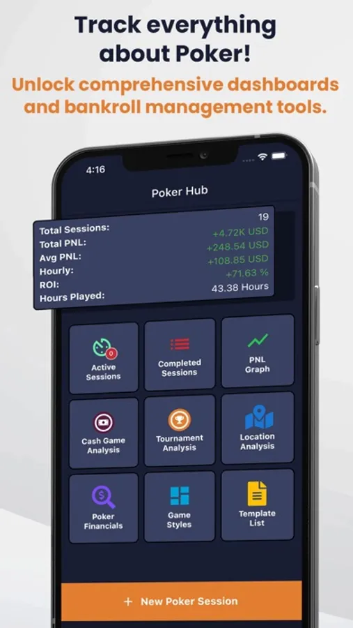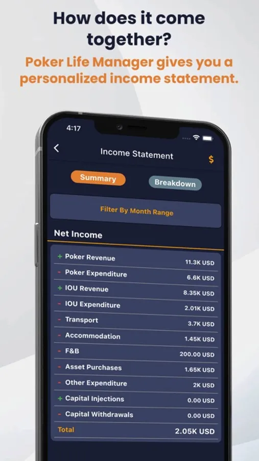 - See all your poker financials, broken down by tournament, cash game, online, or live